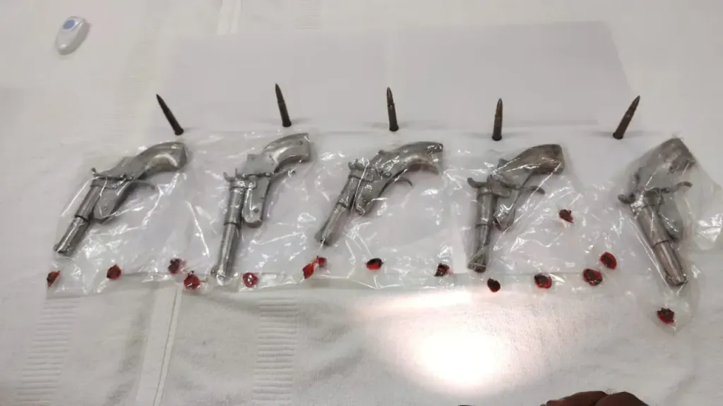 পুলিশ সূত্রে জানাযায় গোপন সূত্রের খবর পেয়ে মুর্শিদাবাদ জেলার সাগরদিঘী থানার ওসি অভিজিৎ সরকারের তৎপরতায় মোড়গ্রাম ৩৪ নম্বর জাতীয় সড়কের ওপরে ন্যাকা চেকিং চালায় গত সোমবার রাত্রে। আর সেই ন্যাকা চেকিং চলাকালীন একটি গাড়ির উপর সন্দেহ হয় পুলিশের।আর সন্দেহ করতেই দুইজন যুবক কে আটক করে তল্লাশি চালায়।তল্লাশি চালাতেই বেরিয়ে আসে পাঁচ রাউন্ড তাজা কার্তুজ সহ পাঁচটি আর্মস। তৎক্ষণাৎ লালগোলা থানার বাসিন্দা এক অভিযুক্ত কে গ্রেফতার করেন সাগরদিঘি থানার পুলিশ।যদিও আরেকজন অভিজুক্ত পলাতক বলে জানাযায়।তবে তার তদন্ত শুরু করেছেন পুলিশ।আর তা নিয়েই সাংবাদিক সম্মেলন করেন জঙ্গিপুর পুলিশ জেলার পুলিশ সুপার ডা: ভোলানাথ পান্ডে মহাশয় তিনি বলেন এতগুলি আগ্নেয় অস্ত্র নিয়ে ধৃত যুবক কোথায় যাচ্ছিলো, কি বা উদ্দেশ্য ছিল তাদের,কোথায় পাচারের উদ্দেশ্যে নিয়ে যাচ্ছিলো, এর সাথে আর কে বা কারা জড়িত রয়েছে তা খতিয়ে দেখতে ধৃত যুবককে ১৪ দিনের পুলিশি হেফাজতের আবেদন রেখে আদালতে তোলা হবে বলে সাংবাদিক সম্মেলন করে জানান তিনি।
