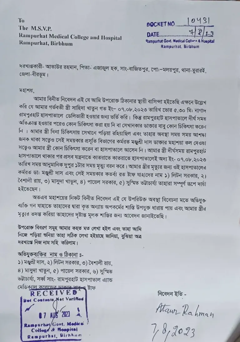 মৃতের পরিচয়ে জানা যায়, সাহিদা খাতুন নামে মুরারই থানার বাজিতপুর গ্রামের গৃহবধূ ছিলেন মৃত ঐ গর্ভবতী মহিলা। মৃতার স্বামী আতাউর রহমান রামপুরহাট মেডিকেল কলেজ ও হাসপাতালের সি এম ও এইচ এবং এম এস ভি পি র কাছে লিখিত অভিযোগ করেন। তার স্ত্রীর মৃত্যুর জন্য মূলত সেই সময় কর্তব্যরত চিকিৎসক মঞ্জুশ্রী দাস সহ অন্যান্য পাঁচজন স্টাফদের বিরুদ্ধে অভিযোগ করেন। প্রসব যন্ত্রণা নিয়ে হাসপাতালের বেডে কাতরাতে থাকলেও মেলেনি কোনো চিকিৎসা। উপরন্তু গর্ভবতীর অসহ্য যন্ত্রনায় ছটফটানির কথা স্টাফদের বলতে গেলে শুনতে হয়েছে নানা কথা বলে মৃতার মায়ের বক্তব্য। পাশাপাশি মৃতার দাদার বক্তব্য ভোর সাড়ে পাঁচটা থেকে দুপুর একটা পর্যন্ত কোনো চিকিৎসাতো হয়নি এমনকি ডাক্তারের কাছে কলবুকও পাঠানো হয়নি। সুপারের কাছে কলবুক রেজিষ্টার দেখতে চাইলেও দেখাতে চাননি।