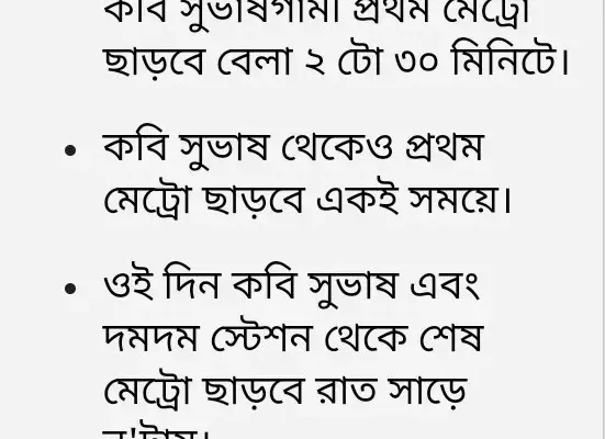 দোলের দিন ইস্ট-ওয়েস্ট রুটের মেট্রোর সময়সূচিও বদল হয়েছে। ওইদিন এই রুটের প্রথম মেট্রো ছাড়বে বেলা তিনটেয়। ফুলবাগান এবং সেক্টর ফাইভ স্টেশন থেকে শেষ মেট্রো মিলবে সন্ধে সাড়ে সাতটায়। এই রুটে চলবে ২০টি মেট্রো।