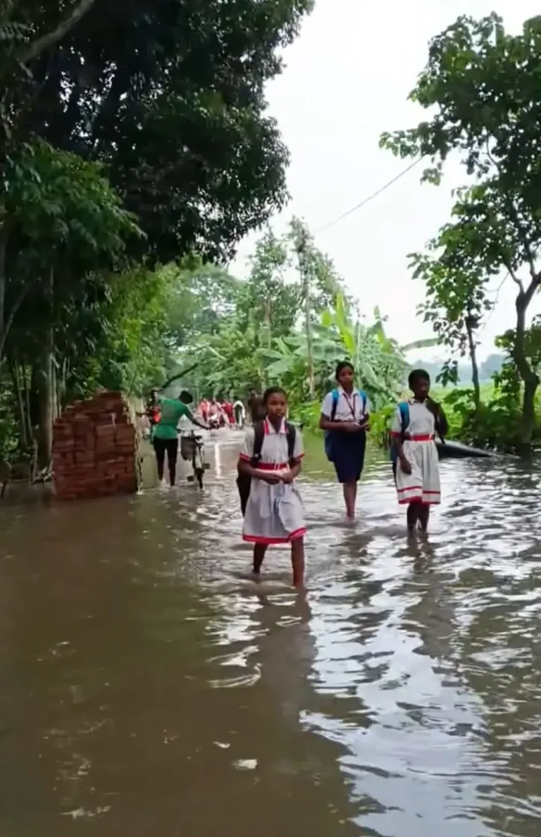 সুবিদ আলি মোল্লা, নতুন গতি : অবিরাম বৃষ্টিপাতের ফলে পশ্চিমবঙ্গের বিভিন্ন জেলায় বন্যা পরিস্থিতির সৃষ্টি হয়েছে। ইতোমধ্যে হাওড়া হুগলির দামোদর তীরবর্তী এলাকা প্লাবিত হয়েছে। পাশাপাশি ডিভিসি থেকে জল ছাড়ার ফলে পরিস্থিতি অনেক জায়গায় নিয়ন্ত্রণের বাইরে চলে গেছে। অন্য জেলার পাশাপাশি উত্তর ২৪ পরগনার যমুনা ও ইছামতি সংলগ্ন বিভিন্ন এলাকা ইতোমধ্যে জলমগ্ন হয়েছে। বিঘার পর বিঘা জমি শস্য নষ্ট হয়ে যাওয়ায় চাষীদের মাথায় হাত। একই সঙ্গে বিভিন্ন সবজির বাজারে অগ্নি মূল্য, যা সাধারন মানুষের ক্রয় ক্ষমতার বাইরে চলে যাচ্ছে। জল জমে যাওয়ায় অনেক স্কুল বন্ধ রাখতে হচ্ছে। নিচু এলাকার মানুষের উঠোন ও ঘরের মধ্যে জল ঢুকছে। যারা মাছ চাষ করেন ইতোমধ্যে পুকুর ভেসে গিয়ে জল মাঠে,রাস্তায় উঠেছে।ভেসে গেছে মাছ। রীতিমতো জল যন্ত্রণার মধ্যে মানুষের জীবন। বহু জায়গায় মানুষ জলবন্দী হয়ে আছেন, বাইরে বেরোতে পারছে না। বৃষ্টি এইভাবে চলতে থাকলে রীতিমত বন্যার পরিস্থিতি দেখা দেবে। বাদুড়িয়া থানার অন্তর্গত চাতরা গ্রাম পঞ্চায়েতের ঘোষপুর, সলুয়া,রসুই ও পাপিলা গ্রামের অবস্থা খুবই শোচনীয় ।সেখানে মানুষের চলাচলের প্রধান রাস্তা জলমগ্ন। সাধারণ মানুষ ও ছাত্রছাত্রীরা রীতিমতো ঝুঁকি নিয়ে স্কুলে যাতায়াত করছে।