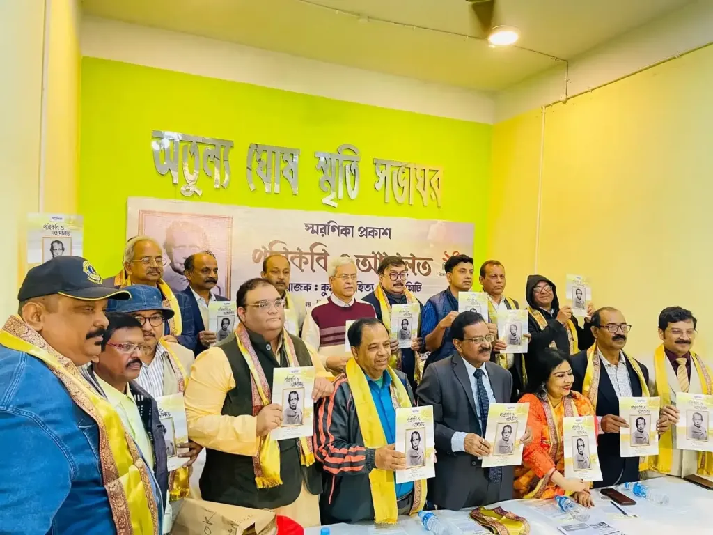 নিজস্ব প্রতিনিধি,শনিবার বিকেলে কলকাতার হাডকো মোড় সংলগ্ন বিধান শিশু উদ্যানে ‘পল্লিকবি ও আদালত’ শীর্ষক স্মরণিকা প্রকাশিত হলো। সেইসাথে ‘বর্ধমান সহযোদ্ধা’ সংগঠনের প্রতিষ্ঠা বার্ষিকী উপলক্ষে গুণীজন সংবর্ধনা প্রদান চলে।পূর্ব বর্ধমান জেলার ‘কুমুদ সাহিত্য মেলা কমিটি’র পরিচালনায় বিধান শিশু উদ্যানের অতুল্য ঘোষ স্মৃতি সভাগৃহে এই সাংস্কৃতিক অনুষ্ঠান টি আয়োজন করা হয়েছিল।এই অনুষ্ঠানে উপস্থিত ছিলেন ওয়েস্ট বেঙ্গল রিয়েল এস্টেট আপিলেট ট্রাইবুনালের চেয়ারপার্সন বিচারপতি রবীন্দ্রনাথ সামন্ত, রবীন্দ্র ভারতী সোসাইটির সাধারণ সম্পাদক সিদ্ধার্থ মুখোপাধ্যায় , রাজ্য যুব কল্যাণ ও ক্রীড়া দপ্তরের ডেপুটি সেক্রেটারি দিলীপ কুমার বিশ্বাস, কলকাতা হাইকোর্টের আইনজীবি মাসুদ করীম।প্রমুখ। একাধারে পল্লিকবি কুমুদরঞ্জন মল্লিকের পুত্র জ্যোৎস্না মল্লিক ছিলেন জেলা ও দায়রা বিচারক, কবির নাতি সুধেন্দ্রনাথ মল্লিক ছিলেন কলকাতা হাইকোর্টের বিচারপতি। এর পাশাপাশি কুমুদ সাহিত্য মেলা কমিটির সিংহভাগ সদস্য আইনী পেশার সাথে যুক্ত। ঠিক এইরকম পরিস্থিতিতে ‘পল্লিকবি ও আদালত’ স্মরণিকা উপস্থাপনা। কবির পরিবার থেকে সাহিত্যিক মহাশ্বেতা বন্দ্যোপাধ্যায় তাঁর বক্তব্যে কুমুদ সাহিত্য মেলা কমিটির প্রতি কৃতজ্ঞতা জানান।