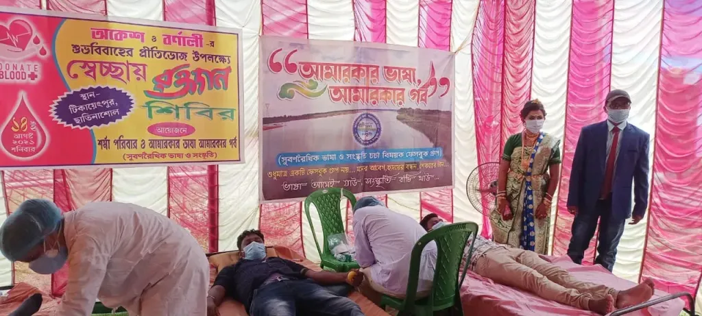 নিজস্ব সংবাদদাতা, গোপীবল্লভপুর, ঝাড়গ্রাম: ফেসবুক গ্রুপ আমরকার ভাষা আমারকার গর্ব-এর সহযোগিতায় ও ঝাড়গ্রাম জেলার গোপীবল্লভপুর-১ ব্লকের ছাতিনাশোল এলাকার টিকায়েৎপুর গ্রামের শর্মা পরিবারের উদ্যোগে বিয়েবাড়ির প্রীতিভোজে অনুষ্ঠিত হলো রক্তদান শিবির। শুক্রবার বিবাহ বন্ধনে আবদ্ধ হয়েছেন টিকায়েৎপুর গ্রামের বাসিন্দা স্বাস্থ্যকর্মী অকেশ শর্মা এবং ছাতিনাশোলের কমলাশোলের বাসিন্দা বর্ণালী জানা। নিজের বিয়ের প্রীতিভোজে রক্তদান শিবির আয়োজনের ইচ্ছের কথা অকেশ শর্মা কিছুদিন আগে সুবর্ণ রৈখিক ভাষা ও সংস্কৃতি চর্চা বিষয়ক ফেসবুক গ্রুপ “আমরকার ভাষা আমারকার গর্ব”-এর পরিচালকদের জানান।এই ইচ্ছার কথা জানতে পেরে সহযোগিতার হাত বাড়িয়ে দেন সুবর্ণ রৈখিক ফেসবুক গ্রুপের সদস্যরা। পরিকল্পনা মতো শনিবার বিয়ের প্রীতিভোজের দিন অকেশ বাবুদের বাড়িতে আয়োজিত প্রীতিভোজ অনুষ্ঠানে অনুষ্ঠিত হয় রক্তদান শিবির। শিবিরে মোট ২১ জন রক্তদাতা রক্তদান করেন তাঁর মধ্যে সাতজনই নতুন রক্তদাতা।