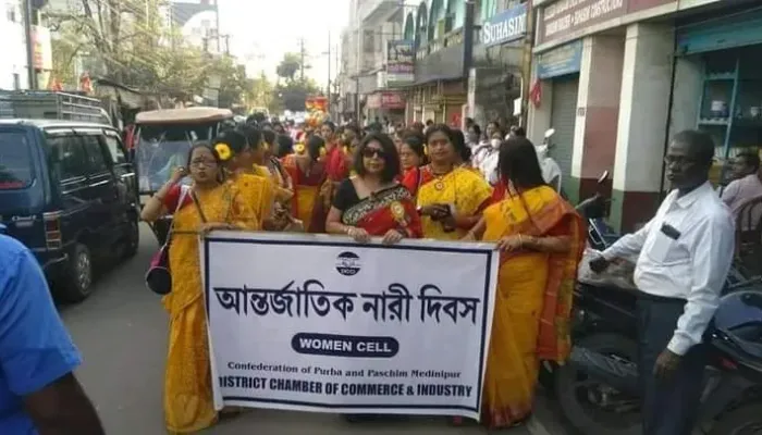 সংবাদদাতা, মেদিনীপুর: কনফেডারেশন অব পূর্ব অ্যান্ড পশ্চিম মেদিনীপুর ডিস্ট্রিক্ট চেম্বার অব কমার্স অ্যান্ড ইন্ডাস্ট্রির (ডিসিসিআই)মহিলা সেলের উদ্যোগে নানা কর্মসূচির মধ্য দিয়ে দিনটি পালিত হয়। এদিন বিকেলে সংস্থার রবীন্দ্রনগরস্থিত অফিস থেকে শুরু করে ধামসা-মাদল-কলসীমাথায় নৃত্য সহ একটি বর্ণাঢ্য শোভাযাত্রা শহরের বিভিন্ন পথ পরিক্রমা করে বিদ্যাসাগর স্মৃতি মন্দিরে পৌঁছায়।শোভাযাত্রার সূচনা কর ভারত চেম্বার অব কমার্স এর লেডিস ফোরামের কো-চেয়ারপার্সন সুজাতা শেঠ। শোভাযাত্রায় নেতৃত্ব দেন ডিসিসিআই এর মহিলা শাখার সভাপতি কান্তা বাসু, সহ-সভাপতি শ্রাবণী মহাপাত্র, সহ-সম্পাদিকা খুসবু মুরারকা সহ অন্যান্যর। শোভাযাত্রায় যেমন ছিলেন সংগঠনের মহিলা শাখার সদস্যারা তেমনি পা মিলিয়েছিলেন সর্বস্তরের মহিলারা এবং বিভিন্ন সংস্থা ও প্রতিষ্ঠানের সঙ্গে যুক্ত বিশিষ্ট জনেরা। সন্ধ্যায় শহরের বিদ্যাসাগর হলে বর্ণময় সাংস্কৃতিক কর্মসূচি অনুষ্ঠিত হয় সংস্থার উদ্যোগে। সাংস্কৃতিক অনুষ্ঠানের পাশাপাশি বিভিন্ন ক্ষেত্রের কৃতি মহিলাদের এবং শিক্ষা, সংস্কৃতি, সমাজসেবা,পরিবেশ সচেতনতার সাথে যুক্ত কৃতি ব্যক্তিবর্গ এবং সংগঠনকে সম্মানিত করা হয়। মহিলাদের “নারী শক্তি সম্মান” এবং “নারী সমৃদ্ধি সম্মান” এই দুটি বিভাগে সম্মানিত করা হয়।