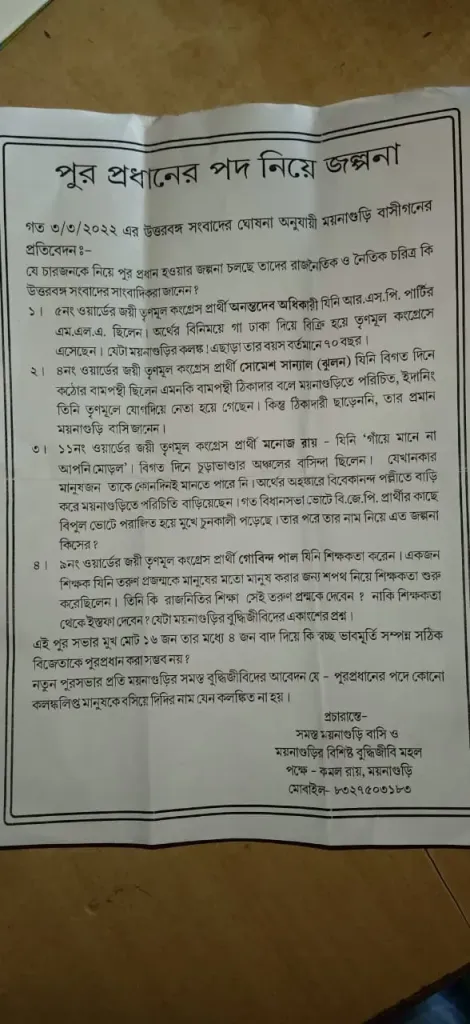 ময়নাগুড়ির পৌরসভা ১৭ টি আসনের মধ্যে ১৬ টি আসন দখল করছে তৃনমূল কংগ্রেস। এর পরেই ময়নাগুড়ি পৌরসভায়, কে চেয়ারম্যান হবেন বা কে ভাইস চেয়ারম্যান হবেন?- এই নিয়ে জল্পনা চলছে। এই জল্পনার মাঝেই রবিবার রাত্রে কে বা কাহারা ময়নাগুড়ি জুড়ে পোস্টার ছাড়িয়ে দেন । এই নিয়ে ময়নাগুড়ি জুড়ে হইচই পড়ে যায়। এই পোস্টারে ময়নাগুড়ির রেলগেট সংলগ্ন এলাকার এক বুথের তৃণমূল কংগ্রেসের বুথ সভাপতি কমল রায়ের নাম লক্ষ্য করা যায়। পরবর্তীতে তৃণমূল নেতা কমল রায় ময়নাগুড়ি থানায় অভিযোগ দায়ের করেন । ঘটনার তদন্তে নামে ময়নাগুড়ি থানার পুলিশ।