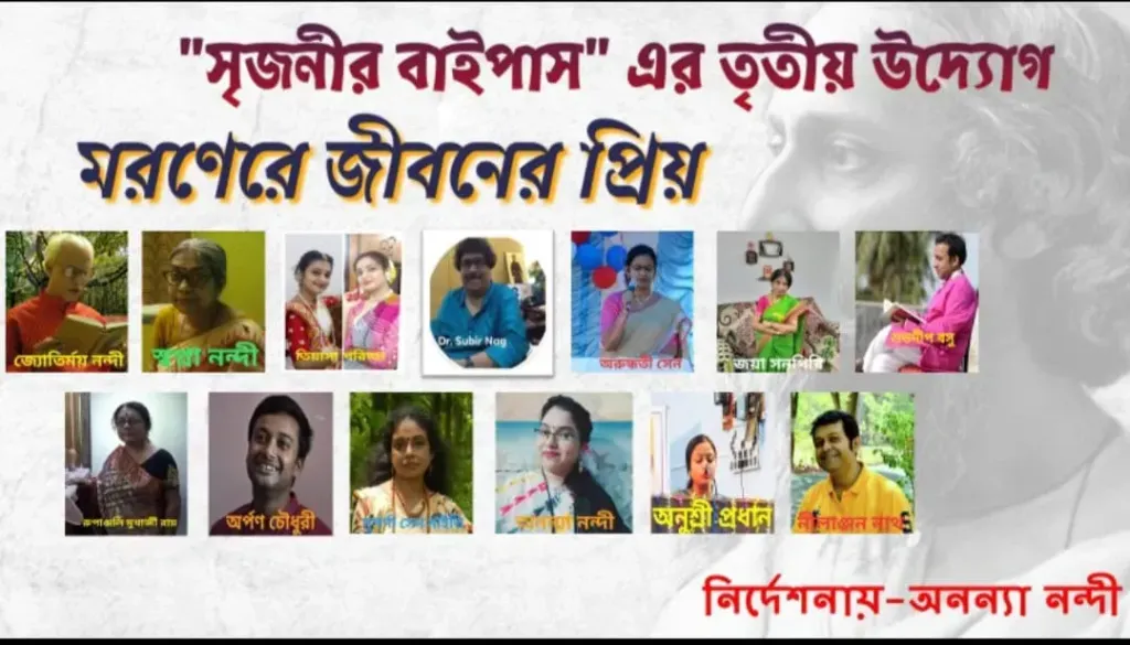 নিজস্ব সংবাদদাতা, নতুন গতি, মেদিনীপুর: ইউ টিউব চ্যানেলের উদ্যোগে শ্রদ্ধা জানানো হলো কবিগুরু কে। বিশ্বকবি রবীন্দ্রনাথ ঠাকুরের প্রয়াণ দিবস ২২শে শ্রাবণকে সামনে রেখে অভিনব ভাবে কবিগুরুকে শ্রদ্ধা জানানো হলো “সৃজনীর বাইপাস” নামক ইউ টিউব চ্যানেলের উদ্যোগে। মোট তিনটি পর্বে বিভক্ত এই অনুষ্ঠানটি ইতিমধ্যেই সোশ্যাল মিডিয়ায় প্রকাশিত হয়েছে। এই অনুষ্ঠানে শুধু মেদিনীপুর বা পশ্চিমবঙ্গ নয়, সমগ্র ভারতের নানান প্রান্তের ১৩ জন বিশিষ্ট শিল্পী অংশগ্রহণ করেছেন। অনুষ্ঠানের মূল ভাবনা “মৃত্যুকে দুঃখ শোকের কারণ মনে না করে, তাতে উদ্বেলিত না হয়ে, তাকে অনন্ত জীবনে উত্তরণের সোপান মনে করে এগিয়ে যাওয়াই শ্রেয়”। অনন্যা নন্দী’র পরিকল্পনা ও নির্দেশনায় সমগ্র অনুষ্ঠানটি পরিবেশিত হয়েছে। শিল্পীদের মধ্যে যেমন কলেজের অধ্যক্ষ সুবীর নাগ, প্রাক্তন অধ্যক্ষ জ্যোতির্ময় নন্দী রয়েছেন তেমনি অধ্যাপিকা স্বপ্না নন্দী, শিক্ষিকা জয়া সনগিরি, অরুন্ধতী সেন, সুপর্ণা মাইতি, রুপাঞ্জলি রায়, অনুশ্রী প্রধান, শিক্ষক শুভদীপ বসু, নীলাঞ্জন নাথ এবং মেডিক্যালের ছাত্র অর্পণ ও ছাত্রী তিয়াসাও রয়েছে। সকলেই নিজ নিজ ক্ষেত্রে যথেষ্ট প্রতিষ্ঠিত। প্রত্যেকের আশা এই দুঃসময়ের দিনে রবীন্দ্রনাথের হাত ধরে কিছুটা সময় শ্রোতারা শান্তি ফিরে পাবেন। অনুষ্ঠানে গান, নৃত্য, আবৃত্তির দ্বারা বিশ্ব কবিকে স্মরণ করা হয়েছে।