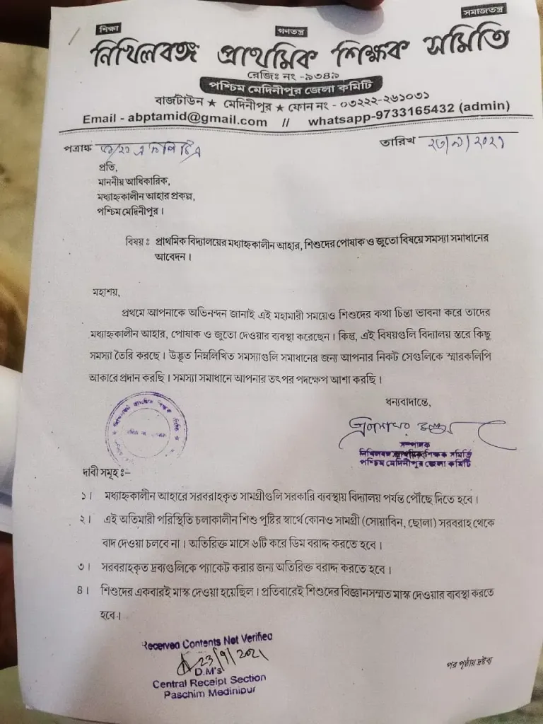 অবস্থান-বিক্ষোভ এর আগে মেদিনীপুর শহরের বার্জ টাউন থেকে দীর্ঘ চার কিলোমিটার বিক্ষোভ মিছিল হয়। বিক্ষোভ মিছিল থেকে কেন্দ্র ও রাজ্য সরকারের বিদ্যালয় বন্ধ রাখার ভ্রান্ত নীতির প্রতিবাদে বিক্ষোভ জানানো হয়।এছাড়াও অবিলম্বে প্রধান শিক্ষক নিয়োগ করা, সাধারণ পেনশন ও রিভাইজড পেনশন দিয়ে হয়রানি বন্ধ করা, প্রতিটি বিদ্যালয়ের শ্রেণী ভিত্তিক শিক্ষক, সিনিয়র শিক্ষকদের লেভেল 10 এর অবসান ঘটানো, মিড ডে মিলে রান্না করা খাবার বিতরণ, অর্থের সঙ্গে সামঞ্জস্য রেখে ছাত্র-ছাত্রীদের পোশাক বিতরন সহ এক গুচ্ছ দাবি নিয়ে ডেপুটেশন দেওয়া হয়।