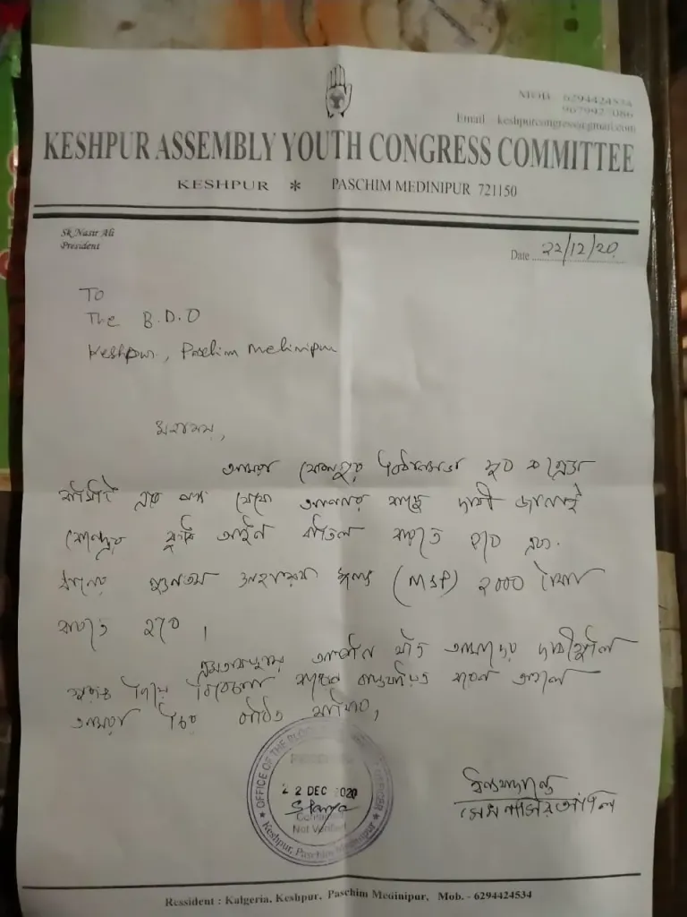 নিজস্ব প্রতিবেদক, মেদিনীপুর: মঙ্গলবার কেশপুর বিধানসভা যুব কংগ্রেস কমিটির পক্ষ থেকে কেশপুর বিডিও অফিসে ডেপুটেশন দেওয়া হলো। কেশপুর বিডিওর কাছে দাবী গুলি ছিলো কেন্দ্রের কৃষি আইন বাতিল করতে হবে ও ধানের ন্যূনতম সহায়ক মূল্য 2000 টাকা করতে হবে ।
