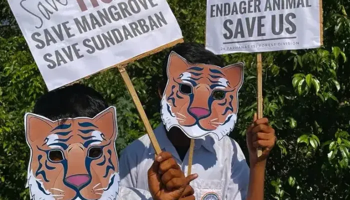 বাবলু হাসান লস্কর, কুলতলি, দক্ষিণ চব্বিশ পরগনা : দক্ষিণ চব্বিশ পরগনার সংরক্ষীত বনাঞ্চল ভুবনেশ্বরীতে স্কুল ছাত্র ছাত্রীদের অভিনব প্রয়াস ম্যানগ্রোভ বাঁচাতে। বন্যপ্রাণীদের রক্ষা করতে কুলতলী বিট অফিসের সহয়তায় কয়েকশত স্কুল পড়ুয়া ,গৃহবধূ ও বনকর্মীদের সাথে বন্যপ্রাণী বাঁচাতে ও ম্যানগ্রোভ রক্ষা করতে হাতে প্ল্যাকার্ড নিয়ে সচেতনতার বার্তা । একাধিক প্লাকাটে বাঘ সাপ হরিণ সহ বন্য জীবজন্তুর ছবির মুখোশ পরে বেশ কিছু এলাকায় পদযাত্রায় অংশ নিতে দেখা যায়। কিছু প্ল্যাকার্ডে সামাজিক বার্তা বিশ্ব উষ্ণায়নকে প্রশমিত করতে ও ম্যানগ্রোভ কে রক্ষা করার বার্তা দিতে অভিনব প্রয়াস কুলতলীর গুড়গুড়িয়া এলাকায়। স্কুল ছাত্র-ছাত্রীদের সঙ্গে গৃহবধূরা এই প্রোগ্রামে অংশ গ্রহণ করেছিল। মূলত কুলতলী বিট অফিস সংলগ্ন গুঁড়গুড়িয়া এলাকায় একসাথে হাতে হাত মিলিয়ে স্কুল ছাত্রছাত্রীরা সচেতনতার প্লাকাট নিয়ে বনকর্মীদের সাথে ম্যানগ্রোভ বাঁচাতে র্যালি করল। কুলতলি বিট অফিসের বড়বাবু শামীম প্রধানও গৃহবধূ সপ্না প্রধানের কথায় বিশেষ করে এই ম্যানগ্রোভ না থাকলে যেভাবে প্রাকৃতিক বিপর্যয় নেমে আসছে গাঙ্গেও সুন্দরবন এলাকায় তাতে আমাদের বসবাসের অনুপযোগী হয়ে পড়তো। এলাকার নদী বাঁধ ভেঙে নোনা জলেপ্লাবিত হলে বিশেষ করে মাটির ঘরবাড়ি ভেঙে তছনছ হয়ে যেত ও গৃহপালিত পশুদের শরীর সমাধি হওয়ার সম্ভাবনা থাকতো। বিশেষ করে এই সুন্দরবনের মধু মাছ কাঁকড়া অর্থকরি ফসল যার দ্বারা সরকার প্রচুর বৈদেশিক মুদ্রা উপার্জন করে এবং এই এলাকার মানুষদের জীবন জীবিকা নির্বাহ হয়। প্রাকৃতিক সম্পদ গুলি বিনষ্ট হলে সাধারণ মানুষের বেঁচে থাকার মতোই অবস্থায় থাকবেনা । আর তার জন্যই আমাদের এই মুহূর্তের প্রয়াস।