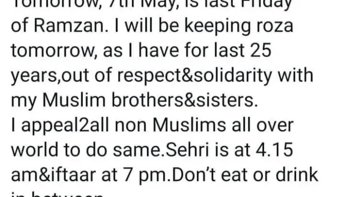 তিনি টুইট করে লেখেন আমি বিগত ২৫ বছর এটা করে থাকি, এটা মূলত আমরা মুসলিম ভাই বোনদের প্রতি সম্মান ও একতা। তিনি বিশ্বের সমস্ত অমুসলিমদের অনুরোধ করেন তারাও যেন এদিন রোজা রাখে, তিনি বলেন সম্ভবত সেহরি সময় 4.15 am, ও ইফতার 7 p.m, তিনি এবং অমুসলিমদের কে নির্দেশ দেন তাঁরা যেনো তাদের মুসলিম বন্ধুদের কাছ থেকে সময় জেনে নেই।