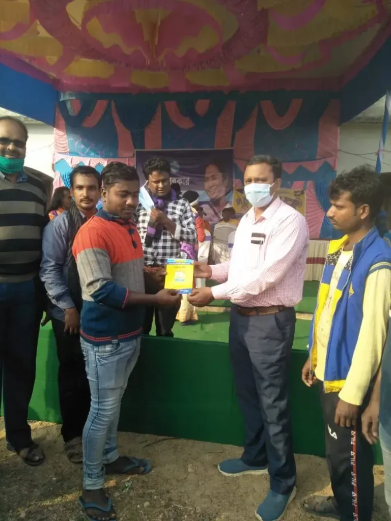 বিডিও দীপক ঘোষ এক উপভোক্তার হাতে জব কার্ড তুলে দিচ্ছেন