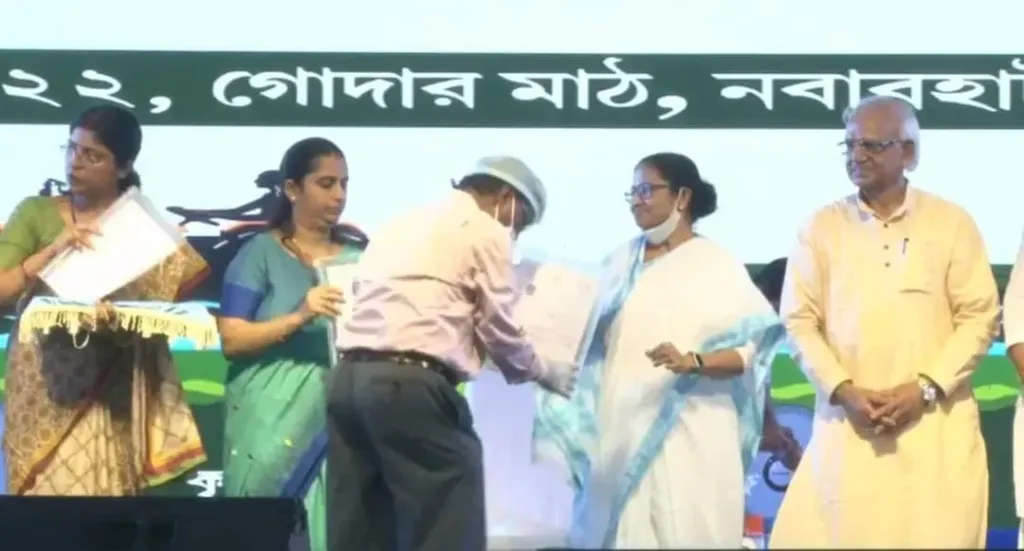 কেন্দ্রীয় সরকারের জনবিরোধী কৃষি আইনের বিরুদ্ধে সর্বভারতীয় স্তরে যে আন্দোলন সংঘটিত হয়েছিল সেই আন্দোলনে সর্বপ্রথম তিনি তাদের পাশে দাঁড়িয়ে ছিলেন। গত ১১ বছরে বাংলায় কৃষকদের তিনগুণ বৃদ্ধি হয়েছে। মুখ্যমন্ত্রী এদিন মঞ্চ থেকে বোতাম টেপার সঙ্গে সঙ্গেই ৮৯ লক্ষ্য কৃষকদের ব্যাংক একাউন্টে ২৩৮৫ কোটি টাকা সরাসরি ঢুকে যায়। এ রাজ্যের ১৮ থেকে ৬০ বছর বয়সী কৃষকেরা মারা গেলে পরিবার ২ লক্ষ টাকা পান। গত নির্বাচনের আগে মমতা বন্দ্যোপাধ্যায় প্রতিশ্রুতি দিয়েছিলেন যে নির্বাচনে জিতলে কৃষকদের ও ক্ষেতমজুরদের আর্থিক অনুদান দ্বিগুণ করবেন। মুখ্যমন্ত্রীর সেই প্রতিশ্রুতির বাস্তবে রূপদান ঘটেছে। কৃষকদের আর্থিক অনুদান ৬ হাজার টাকা বাড়িয়ে ১০ হাজার করেছেন বলে মুখ্যমন্ত্রী জানান। রাজ্য সরকারের বিভিন্ন প্রকল্পের আওতায় এখনো যারা আসতে পারেননি তাদেরকে দুয়ারের সরকার কর্মসূচির মধ্যে নথিভূক্ত করতে পারবেন বলে ঘোষণা করেন। এই দিন মুখ্যমন্ত্রী কৃষি আধিকারিকদের উদ্দেশ্যে হুশিয়ারি দিয়ে বলেন, জমি, জায়গা মিউটেশনের আর বিলম্ব করা চলবে না। দুয়ারের সরকার কর্মসূচির মধ্যেও মিউটেশনের ব্যবস্থা থাকবে। মুখ্যমন্ত্রী এদিন আরও বলেন, ২৫ থেকে ৬০ বছর বয়সী মহিলা দের লক্ষীর ভান্ডার প্রকল্পে সুযোগ পান। যাদের ৬০ বছর পেরিয়ে গেছে তারা বার্ধক্য ভাতা র সুযোগ পাবেন। ১১ বছরে ৫৭ লক্ষ টন খাদ্যশস্যের উৎপাদন বেড়েছে। শস্য বীমার জন্য রাজ্য বছরে ৭০০ কোটি টাকা খরচ করে। রাজ্য সরকার কৃষকরত্ন দিয়ে কৃষকদের সমানভাবে সম্মানিত করে আসছে। মাটিগাথা প্রকল্প গড়ে তোলা হবে বলে মুখ্যমন্ত্রী জানান। এখানে কৃষকদের যন্ত্রপাতি মেরামত এর ব্যবস্থা থাকবে। কৃষি ক্ষেত্রে রাজ্য ডাল, ভুট্টা, তৈলবীজ উৎপাদন বৃদ্ধি করে নজির সৃষ্টি করেছে। রাজ্য কৃষি ক্ষেত্রে আমূল পরিবর্তন ঘটিয়েছে বিজেপি নেতৃত্বাধীন কেন্দ্রীয় সরকার তা সহ্য করতে পারছে না। বাংলার প্রতি বঞ্চনা, বাংলা আর সহ্য করতে পারবেনা। প্রয়োজনে কেন্দ্রের বিরুদ্ধে বৃহত্তর আন্দোলন গড়ে তুলবেন বলে এদিন মুখ্যমন্ত্রী জানান। এদিনের অনুষ্ঠানে অন্যান্যদের মধ্যে উপস্থিত ছিলেন মন্ত্রী শোভন দেব চট্টোপাধ্যায়, স্বপন দেবনাথ, মলয় ঘটক, জেলাশাসক প্রিয়াঙ্কা সিংলা, পূর্ব বর্ধমান জেলা তৃণমূল সভাপতি তথা বিধায়ক রবীন্দ্রনাথ চট্টোপাধ্যায় সহ প্রশাসনিক ও রাজনৈতিক বিভিন্ন কর্তাব্যক্তিরা অনুষ্ঠানে উপস্থিত ছিলেন।