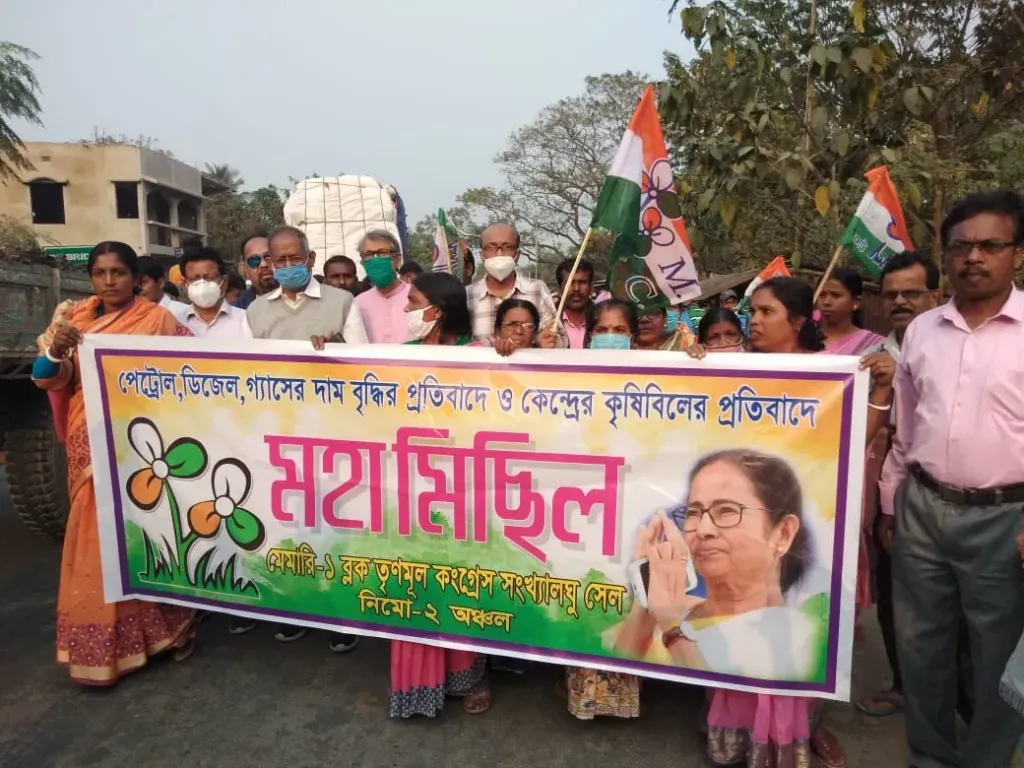 সেখ সামসুদ্দিন : মেমারি বিধানসভার নিমো ২ অঞ্চলের জোড়াসাঁকো টেকনিক্যাল কলেজ মোড় থেকে আজাপুর ফুটবল মাঠ পর্যন্ত মহামিছিল করা হয়। অঞ্চল তৃণমূল সংখ্যালঘু সেলের উদ্যোগে পেট্রোল, ডিজেল গ্যাসের ও কেন্দ্রীয় কৃষি বিলের বিরুদ্ধে এই মিছিল করা হয়। মিছিলে উপস্থিত ছিলেন বিধায়ক নার্গিস বেগম, প্রাক্তন বিধায়ক অধ‍্যাপক ড. আবুল হাসেম মন্ডল, জেলা সহ সভাপতি স্বপন বিষয়ী, দুই সাধারণ সম্পাদক সুপ্রিয় সামন্ত ও স্বপন ঘোষাল, জেলা যুব সাধারণ সম্পাদক নিত‍্যানন্দ ব‍্যানার্জী, ব্লক সভাপতি মধুসূদন ভট্টাচার্য, ব্লক সংখ্যালঘু সভাপতি মীর পারভেজ উদ্দিন সহ নেতৃত্ব। কয়েক হাজার মানুষকে নিয়ে আজকের মিছিল থেকেও বিজেপিকে বার্তা দেওয়া হল ময়দানে কিন্তু ভয়ঙ্কর খেলা হবে।