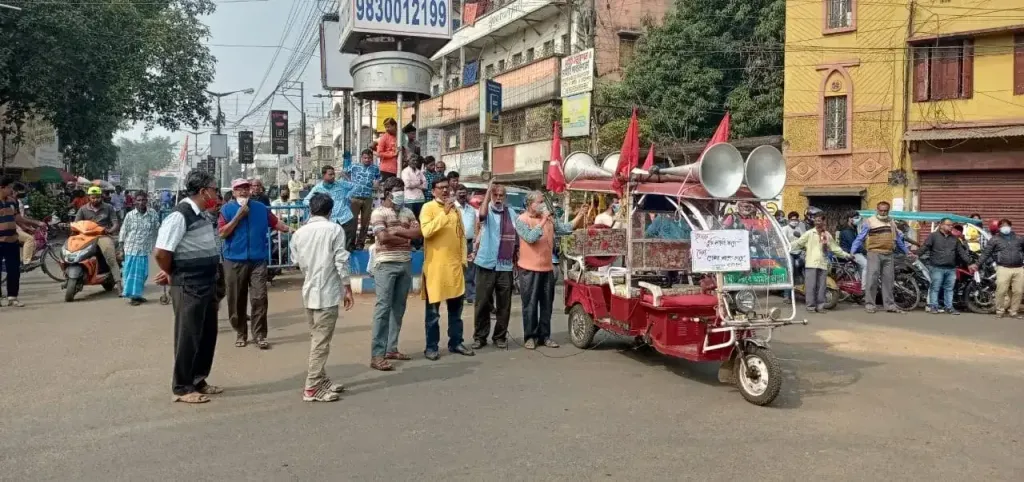 নিজস্ব সংবাদদাতা, নতুন গতি, মেদিনীপুর: দেশ জুড়ে চলা কৃষক অসন্তোষের মধ্যেই বিজেপির নেতৃত্বাধীন কেন্দ্র সরকার প্রণীত নতুন কৃষি আইন বাতিলের দাবিতে এবং দিল্লির কৃষক আন্দোলনকে সমর্থন জানিয়ে সারা দেশের সঙ্গে তাল মিলিয়ে সোমবার পশ্চিম মেদিনীপুর জেলার মেদিনীপুর শহরের কেরানীটোলার চৌরাস্তা মোড়ে পথ অবরোধ করলো বামপন্থী দলগুলো। এদিন সকাল ১১টার পর পথ অবরোধ শুরু হয় এবং প্রায় আধ ঘন্টা ধরে চলে এই অবরোধ। অবরোধ চলাকালীন কেন্দ্রের কৃষি আইন প্রত্যাহারের দাবিতে ও কৃষক আন্দোলনের সমর্থনে মুহুর্মুহু শ্লোগান দিতে থাকেন বাম কর্মী সমর্থকরা। অবরোধের শেষলগ্নে ভারতের প্রধানমন্ত্রী নরেন্দ্র মোদী ও স্বরাষ্ট্র মন্ত্রী অমিত শাহের কুশপুতুল দাহ করেন অবরোধকারীরা।