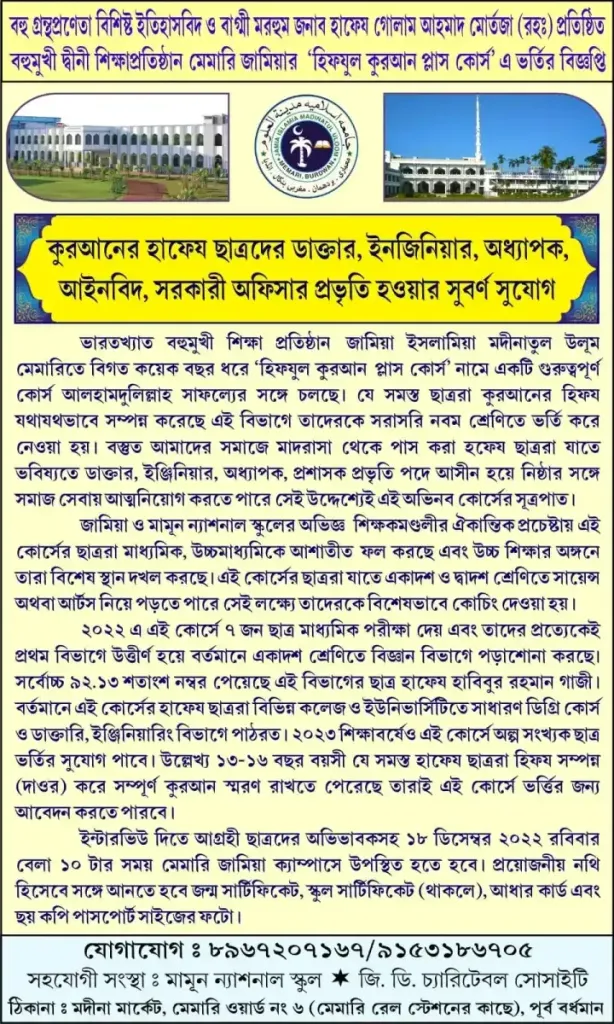 নিজস্ব সংবাদদাতা : পূর্ব বর্ধমানের মেমারিতে খ্যাতনামা ঐতিহাসিক ও যশন্ত্রী বাগ্মী মরহুম গোলাম আহমাদ মোর্তজা সাহেব (রহ.) প্রতিষ্ঠিত মামুন ন্যাশনাল স্কুল বয়েজ ক্যাম্পাস মেমারিতে অনুষ্ঠিত হলো পঞ্চম থেকে নবম শ্রেণির এম ক্যাট উত্তীর্ণ ছাত্র-ছাত্রীদের কাউন্সেলিং। জি ডি এম সি সারা রাজ্যব্যাপী এই পরীক্ষার ব্যবস্থা করেন। পরবর্তী পর্যায়ে রাজ্যের ছ’টি জেলায় চলছে পরীক্ষায় উত্তীর্ণ ছাত্র-ছাত্রীদের কাউন্সেলিং। ব্যাপক সংখ্যক ছাত্র-ছাত্রী এই কাউন্সেলিং এ অংশগ্রহণ করেন।