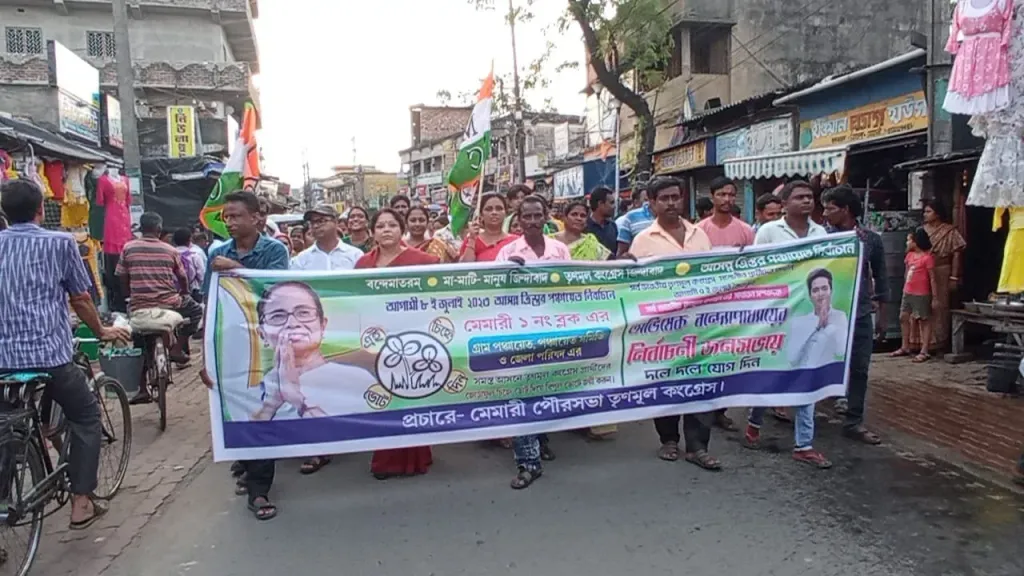 সেখ সামসুদ্দিন, ৪ জুলাইঃ আসন্ন ত্রিস্তর পঞ্চায়েত নির্বাচনে তৃণমূল কংগ্রেস প্রার্থীদের সমর্থন মেমারি পৌরসভা তৃণমূল কংগ্রেস কমিটির উদ্যোগে একটি মহা মিছিল করা হয়। মিছিলটি চেকপোস্ট পৌরসভার সামনে থেকে শুরু করে বামুনপাড়া মোড়, নিউমার্কেট, স্টেশন বাজার, রেলগেট, কৃষ্ণ বাজার, চকদিঘি মোড় হয়ে দক্ষিণ মেমারিতে শেষ হয়। পৌরপ্রধান স্বপন বিষয়ী, উপপ্রধান সুপ্রিয় সামন্ত সহ কাউন্সিলরবৃন্দ এবং ওয়ার্ডের কর্মী সমর্থকবৃন্দ ছাড়াও মেমারি ১ ব্লক তৃণমূল কংগ্রেস সভাপতি নিত্যানন্দ ব্যানার্জী সহ ব্লক স্তরের শাখা সংগঠনের নেতৃত্ব পা মেলান এই মিছিলে।