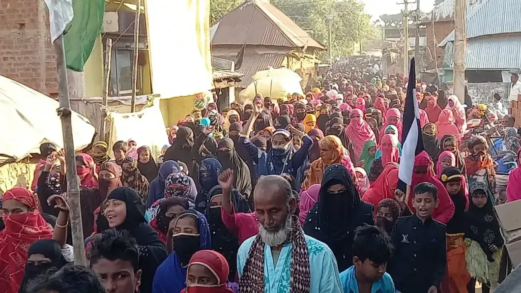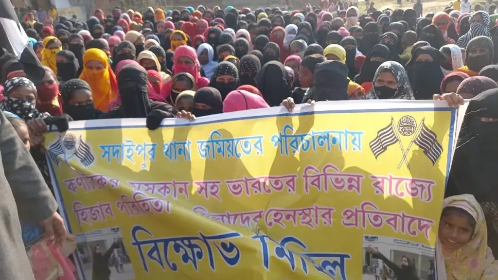 সেখ রিয়াজুদ্দিন, বীরভূম: সম্প্রতি কর্ণাটকের একটি কলেজের সামনে হিজাব পরিহিতার কারণেই একদল কিশোরের কাছে হেনস্তার শিকার হতে হয় মুসকান খান নামে এক শিক্ষার্থীকে।সেই হিজাব বিতর্ক শেষ পর্যন্ত সুপ্রিম কোর্ট পর্যন্ত গড়িয়েছে।সেই ঘটনার পরিপ্রেক্ষিতে তথা মুসকান ও অন্যান্য হিজাব পরিহিতা মহিলাদের হেনস্থার প্রতিবাদে শুক্রবার বীরভূম জেলা জমিয়তে উলামায়ে হিন্দের সভাপতি মৌলানা আনিসুর রহমান সাহেবের নির্দেশে এবং দুবরাজপুর ব্লকের সদাইপুর থানা জমিয়্তে উলামায়ে হিন্দের পক্ষ থেকে হিজাব পরিহিতা মহিলাদের নিয়ে একটি প্রতিবাদ ও বিক্ষোভ মিছিল সংগঠিত হয়।