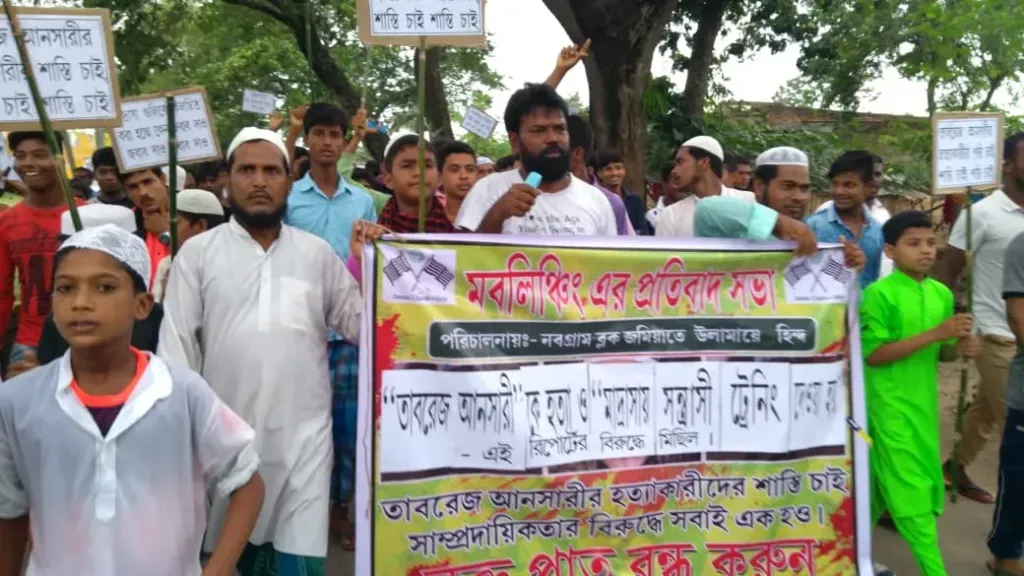 পেহেলু খান , আখলাক , জুনায়েদ হত্যার পরে তাবরেজ ও মালদা জেলার সেনাউল হত্যা কে কেন্দ্র করে দেশের বিভিন্ন এলাকায় উঠেছে দোষীদের শাস্তির দাবী । দেশের বাইরে রাষ্ট্রসংঘে মব লিঞ্চিং এর কারনে মুখ পুড়েছে দেশের , প্রশ্নের মুখে পড়েছে ভারতের নিরপেক্ষতা । দেশ জুড়ে মব লিঞ্চিং এর বিরােধিতায় বাদ যায়নি এ রাজ্যও ।মব লিঞ্চিং এর বিরুদ্ধে ও মাদ্রাসাকে সন্ত্রাসের আখরা বলার প্রতিবাদ জানিয়ে সম্প্রীতির মিছিল বার করলাে মুর্শিদাবাদ জেলার নবগ্রাম থানার নারকেল বাগান এলাকার মানুষ । সংখ্যায় হাজার হাজার মানুষ রাস্তায় নামলাে । মিছিলে উঠলাে ভারত বাঁচাও – ও তাবরেজের হত্যাকারীদের ফাঁসির স্লোগান ।