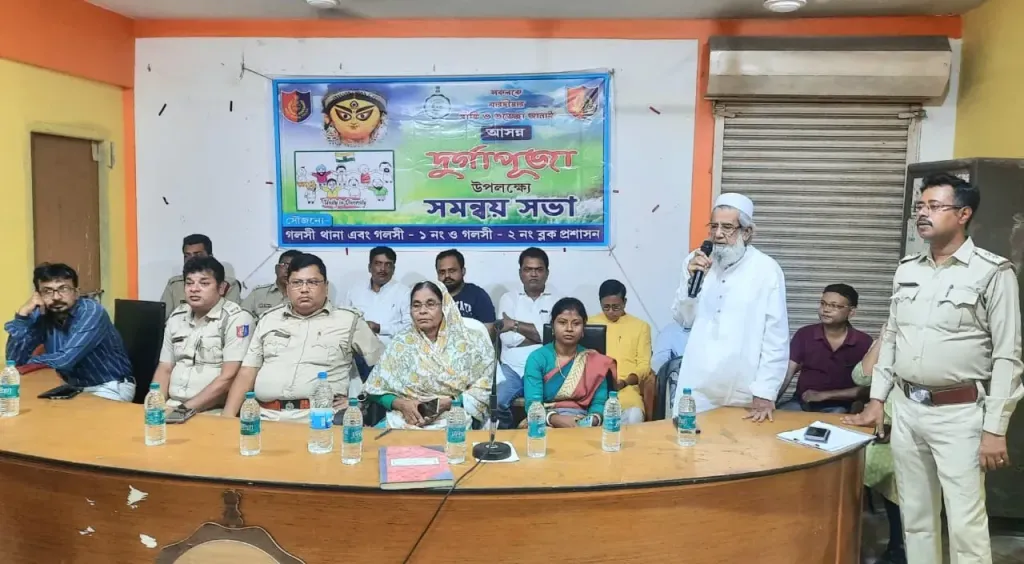 আজিজুর রহমান,গলসি : গলসি ২ নং বিডিও সভাকক্ষে প্রায় ৮০টি পূজো কমিটিকে নিয়ে একটি সমন্বয় সভার আযোজন করা করলো গলসি থানা ও গলসি ১ ও ২ ব্লক প্রশাসন। পুলিশ প্রশাসনের বিভিন্ন কর্তাদের পাশাপাশি হাজির ছিলেন এলাকার পূজো উদ্যোগতারা। যেখানে সরকারি বিভিন্ন বিধিনিষেধ তুলে ধরার সাথে সাথে সচেতনার বার্তা দেওয়া হয়। পুজোর দিনগুলি যাতে ভালো ভাবে কাটে তারজন্যই ওই সমন্বয় সভা বলে জানা গেছে। পুলিশ ও প্রশাসনের ওই কাজে খুশি এলাকার মানুষ। উক্ত সভায় উপস্থিত ছিলেন গলসি ২ নং ব্লক সমষ্টি উন্নয়ন আধিকারিক সঞ্জীব সেন, ডিএসপি অতনু ঘোষাল, সি.আই সাধন ব্যানার্জী, গলসি থানার ওসি দীপঙ্কর সরকার, মেজবাবু রতন দাস সহ গলসি ১ ও ২ পঞ্চায়েত সমিতির সভাপতি, সহ সভাপতি এবং বিদ্যুৎ দপ্তর ও স্থানীয় অগ্নি নিবাপক কেন্দ্রের প্রতিনিধিরা।