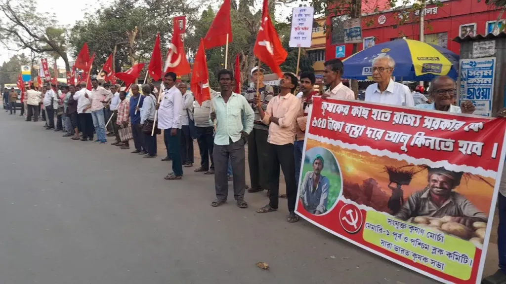 নূর আহমেদ,মেমারি: ২৮ ফেব্রুয়ারি,শুক্রবার বৈকালে সংযুক্ত কিষাণ মোর্চা মেমারি ১ পূর্ব ও পশ্চিম ব্লক কমিটির সারা ভারত কৃষকসভার উদ্যোগে মেমারি চকদিঘী মোড় সিআইটিইউ অফিসের সামনে অবস্থান বিক্ষোভ দেখানো হয়। পরে মেমারি চৌমাথা মোড়ে প্রতীকি পথ অবরোধ করা হয়। বিক্ষোভ সভায় বক্তব্য রাখেন কৃষক মহাসভার শ্রীকান্ত রানা, কৃষকনেতা জয়দেব ঘোষ, ব্লক কৃষকসভার সদস্য সঞ্জয় গুঁই, সিআইটিইউ এর পক্ষে সনৎ ব্যানার্জী। বক্তারা বলেন, আমাদের দাবী রাজ্য সরকারকে কৃষকের কাছ হতে ৬৫০ টাকা বস্তা দরে আলু নিতে হবে। এক বিঘে জমিতে গড়ে ৮০ বস্তা করে উৎপাদন হয়, এতে খরচ হয়েছে হয় ৩৮ থেকে ৪০ হাজার টাকা। সরকার নির্ধারিত ৪৫০ টাকা বস্তা মূল্য বিক্রি করলে চাষী ২০০০ টাকা ক্ষতি হবে, ফলে চাষীর কোন লাভ হবে না। তাই আমাদের দাবী ৬৫০ টাকা বস্তা করে দিলে খানিকটা লাভ হবে।