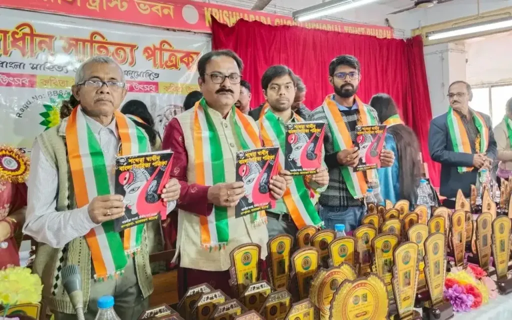 নিজস্ব প্রতিনিধি, কলকাতা : শনিবার, কবি মনোরঞ্জন আচার্য্য সম্পাদিত শব্দেরা স্বাধীন সাহিত্য পত্রিকার সংখ্যা প্রকাশ অনুষ্ঠান অনুষ্ঠিত হয় কৃষ্ণপদ ঘোষ মেমোরিয়াল ট্রাস্ট সভাগৃহে। বিশ্ববঙ্গ বাংলা সাহিত্য একাডেমী অনুমোদিত এই পত্রিকার এদিনের অনুষ্ঠানে সভাপতিত্ব করেন ওই একাডেমীর প্রধান উপদেষ্টা ও শব্দেরা স্বাধীনের সভাপতি বিশিষ্ট কবি সঞ্জয় কুমার মুখোপাধ্যায়। বিশেষ অতিথি হিসেবে আসন অলঙ্কৃত করেন শব্দেরা স্বাধীন সাহিত্য পত্রিকার প্রধান উপদেষ্টা ও বিশ্ববঙ্গ বাংলা সাহিত্য একাডেমির প্রধান পৃষ্ঠপোষক কবি দেবপ্রসাদ বসু, ছিলেন উপকৃত পত্রিকার উপদেষ্টা ও ‘অনুভূতির কথায়’ কৃষ্টিগত সাময়িকীর সম্পাদক ও ‘নতুন গতি’র সাংবাদিক কবি হামিম হোসেন মণ্ডল (বুলবুল), ‘নির্বাণ বুকস’-এর প্রকাশক তন্ময় মণ্ডল, কবি সৌমেন্দ্র নাথ মহাতো, কবি বীরেন আচার্য্য প্রমুখ।