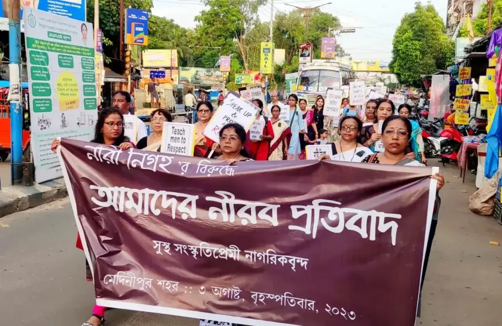 নিজস্ব সংবাদদাতা, মেদিনীপুর : বিশ্ব তথা দেশের বিভিন্ন প্রান্তে ঘটে চলা নারী নিগ্রহের ঘটনার বিরুদ্ধে পথে নামলেন মেদিনীপুর শহরের সুস্থ সংস্কৃতি মনস্ক নাগরিক বৃন্দ।”নারী নিগ্রহের বিরুদ্ধে আমাদের নীরব প্রতিবাদ” শিরোনামে একটি মৌন মিছিল অনুষ্ঠিত হলো মেদিনীপুর শহরে। কালো ব্যাজ করে হাতে বিভিন্ন ধরনের প্লাকার্ড নিয়ে নীরবে প্রতিবাদে সামিল হলেন শতাধিক সংস্কৃতিপ্রেমী নাগরিক। মিছিলে সামিল হয়েছিলেন শিক্ষক-শিক্ষিকা,কবি-সাহিত্যিক, নৃত্যশিল্পী, সঙ্গীতশিল্পী, বাচিক শিল্পী, চিত্রশিল্পী, আলোকচিত্র শিল্পী, অভিনেতা-আভিনেত্রী , সমাজকর্মী থেকে শুরু করে সমাজের বিভিন্ন ক্ষেত্রের বিশিষ্ট জনেরা।