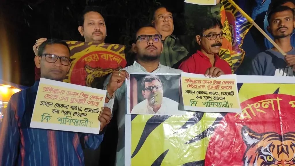 নতুন গতি প্রতিবেদক : হিন্দি সিনেমা অভিনেতা তথা বিজেপি নেতা পরেশ রাওয়াল বাঙালিকে বাংলাদেশী ও রোহিঙ্গা বলেছে এবং বাঙালিদের নিয়ে গুজরাটিদের মধ্যে ব্যাপক বাঙালি বিদ্বেষ ছড়িয়েছে। উল্লেখ্য বাঙালির মাছ খাওয়া নিয়েও অপমান করেছে পরেশ রাওয়াল। এর বিরুদ্ধেই গতকাল কলকাতার রানুছায়া মঞ্চে বিক্ষোভ কর্মসূচী করল ভারতে বাঙালির জাতীয় সংগঠন বাংলা পক্ষ৷ বাংলার মাটিতে পরেশ রাওয়ালকে বয়কটের ঘোষণা দিল বাংলা পক্ষ। বাংলা তথা ভারতে তীব্র বাঙালি-বিদ্বেষ ছড়ানোর বিরুদ্ধে প্রতিরোধে নামছে বাংলা পক্ষ। প্রতিবাদের অংশ হিসাবে মাছ খেয়ে বাংলায় সর্বত্র মাছ খাওয়া এবং মাছ খাওয়া বাঙালি জাতির অধিকার দ্বিগুণ ভাবে প্রতিষ্ঠিত করার শপথ নেওয়া হল।
