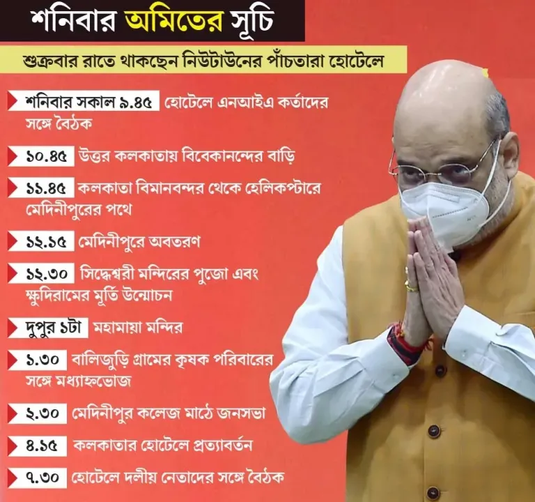 বৈঠক শেষ করেই অমিত যাবেন স্বামী বিবেকানন্দের পৈত্রিক বাড়িতে। আধ ঘণ্টা সেখানে কাটাবেন। ১১টা ১৫ মিনিটে স্বামীজির বাড়ি থেকে দমদম বিমানবন্দর যাবেন। সেখান থেকে বিশেষ হেলিকপ্টারে মেদিনীপুরের উদ্দেশে রওনা দেবেন। বেলা আড়াইটেয় মেদিনীপুরের কলেজ ময়দানে অমিতের দলীয় জনসভা। শুভেন্দু অধিকারীর ওই সভাতেই যোগ দেওয়ার কথা বিজেপি-তে। শুভেন্দুর সঙ্গে আরও অনেক তৃণমূল নেতা বিজেপি-তে যোগ দিচ্ছেন বলে খবর। রবিবার শান্তিনিকেতন যাবেন স্বরাষ্ট্রমন্ত্রী। সেখানেও অনুব্রত মণ্ডলের শহর বোলপুরে এক রোড শো-য় অংশ নেবেন তিনি।